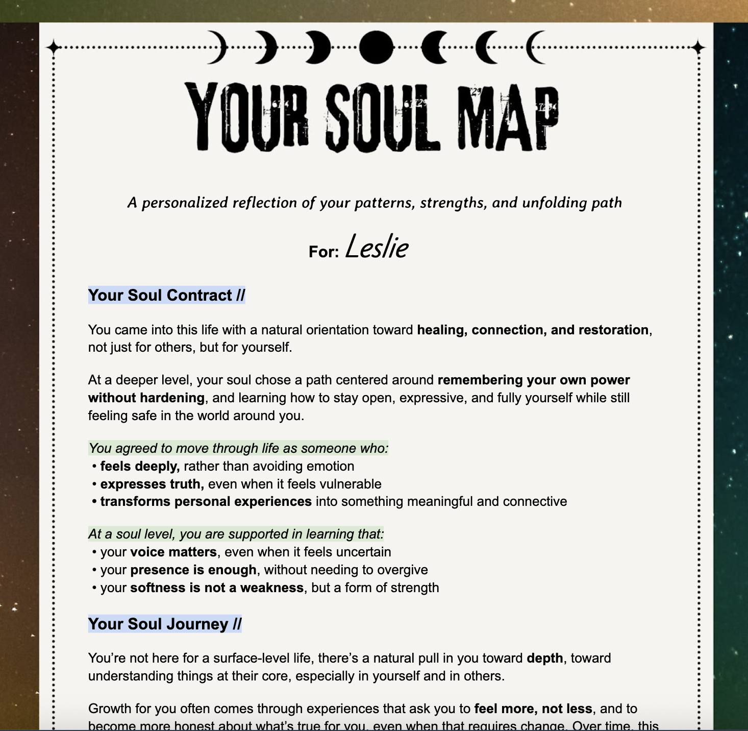 “You are an angel from heaven. I have so much to say about how deeply this touched me. The Soul Atlas felt like cosmic confirmation at the exact moment I needed it, surrounding a life-changing decision. Every word resonated, affirmed my knowing, and gave me the confidence that I’m aligned with my highest path.” - Leslie
